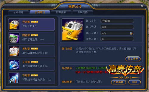 公司一共有行政部、财务部、策划部、公关部、市场部5个部门,分别负责着公司各种操作的进行。当公司的高管达到部门所需升级条件时,可以升级部门。