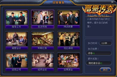 作为一家公司的最终BOSS,每位老板都是神龙见首不见尾,对于老板的种种猜测也一直成为办公室津津乐道的话题。想知道老板一天的工作吗?来吧,一起走近日常事务,体验老板的忙碌生活。作为玩家成长的重要环节,陪游富豪传奇日常事务会为玩家来各项属性的提升,使玩家能够获得更高的头衔。而这些头衔则都是学习管理技能的必要条件。想超越自己,实现更高的目标?日常事务,千万不要错过!