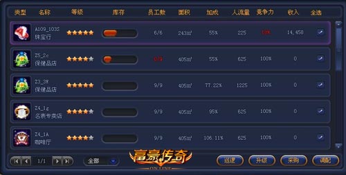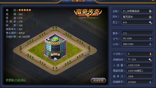 店铺等级又称店铺星级,决定着店铺辐射范围的大小,是影响店铺收入的关键因素。店铺一共分为5级,每一级对店铺的认知值有着不同的要求。店铺人流量则由店铺辐射范围和范围内人流量共同决定。等于店铺辐射范围与辐射街区内人流量的乘积。在陪游富豪传奇中,一家小小的烟酒店都可以成为摩天大楼哦!