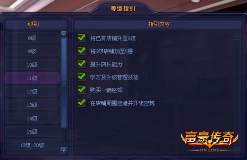 如果玩家是第一次开公司,第一次做老板也不用担心,我们的秘书是一位经验丰富的帮手哦!在初期,每当公司提升等级的时候秘书都会给玩家做出提示,帮助玩家尽快学会如何经营公司。在公司16-20级的时候,秘书会指引玩家将已有的店铺升至5级;将5级店铺加盖至5层;提升店长能力;学习及升级管理技能;购买一辆座驾;在店铺周围建造并升级建筑等,这些指引可是非常有用的,可以清楚告知玩家在这个等级里该做什么。