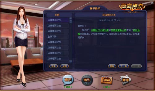 在秘书每日的工作里,最重要的就是给玩家的提示了,身为一家公司甚至一个集团的老总,玩家自然会对一些细节问题关注的不是很多,比如店铺遭到竞争对手攻击;公司的业绩下降;出现竞争店铺等等这些问题。而我们的秘书就会帮助玩家时刻关注并立即提醒玩家采取措施,往往有些玩家不怎么关心的小细节会造成巨大的损失哦!有了我们的秘书在,可以很大程度降低这种事件发生。