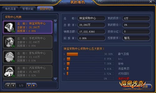 陪游富豪传奇中基本上可以分为36种商品,并分别对应36个采购中心。每当玩家的VIP等级达到了一定的级别时,对应的采购中心就会开启,玩家可以对其进行投资。VIP等级分为4个阶段,8级可以开放药品、中餐、汽车、酒吧、户外用品、家私、服装、手机、珠宝等采购中心;14级可以开放便利、西餐、化妆品、KTV、玩具、灯饰、皮具、数码、名表等采购中心;20级可开放烟酒、甜品、超市、影视、图书、床上用品、婴儿用品、影音、香水等采购中心;VIP达到26级别就可开放保健品、咖啡、宝货、SPA、乐器、建材、鞋类、电脑、古玩等采购中心。