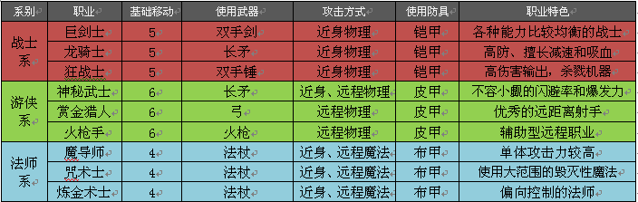 战士系(巨剑士,龙骑士,狂战士):其职业特点是高防御厚血,主要的攻击手段是近身单体攻击。