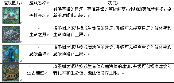 《圣树传说》中的建筑分为英雄祭坛、生命之殿、魔法晶塔和远古遗迹四种。