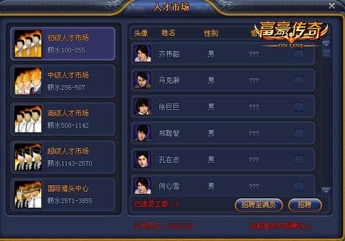 在公司刚起步的时候,员工对公司所带来的效果并不是特别明显,初期只需要在初级人才市场招募就足够了,员工属性包括员工的基础属性、员工等级和悟性,在初级人才市场所招募的员工属性相对都比较低,但是也不排除有高悟性的员工哦!当公司发展到一定的程度时,就要考虑在高级人才市场选择人才了,高级市场招募的员工不仅基础属性都比较高,而且相对有很高的几率会有高悟性的人才哦,不过在高级人才市场招募的员工薪水相对比较高,各位玩家还是要酌情选择的。