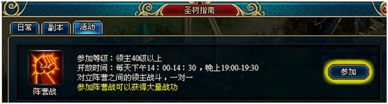 玩家达到40级以后,点击右上角的“活动”按钮,可以进入阵营战界面,如果当前活动正在进行,相应的按钮会发光提示您点击。
